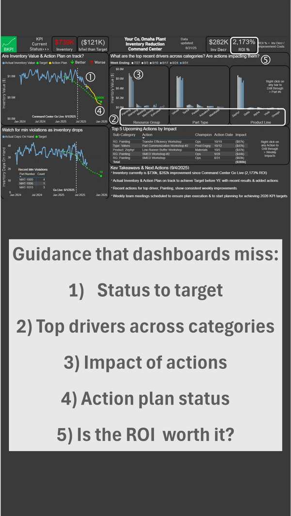 Here’s an example: a command center for cutting inventory & freeing up cash. Built on existing data, it answers the essential questions dashboards miss: